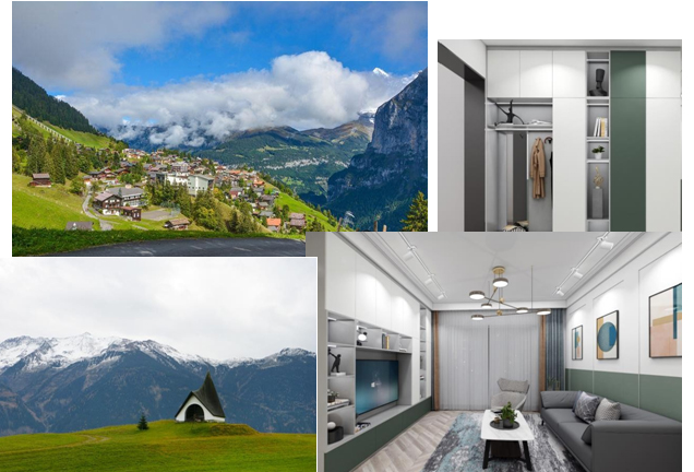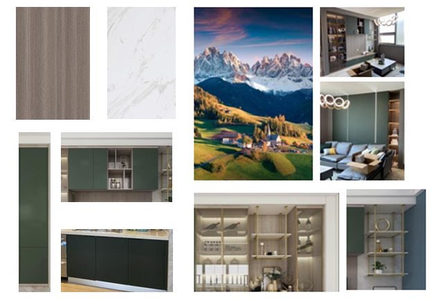 Plain green and Thai Emperor grey pomelo tones evoke the serene beauty of the Alps, crafting a visually stunning ambiance. The incorporation of metal accents enhances the space with sophisticated textures and a modern edge. Meticulously chosen E0 standard panels ensure a green, health-conscious environment, prioritising safety and sustainability. This thoughtful design approach creates a vibrant, natural, and luxurious living space, blending comfort with understated elegance for a refined light luxury experience.