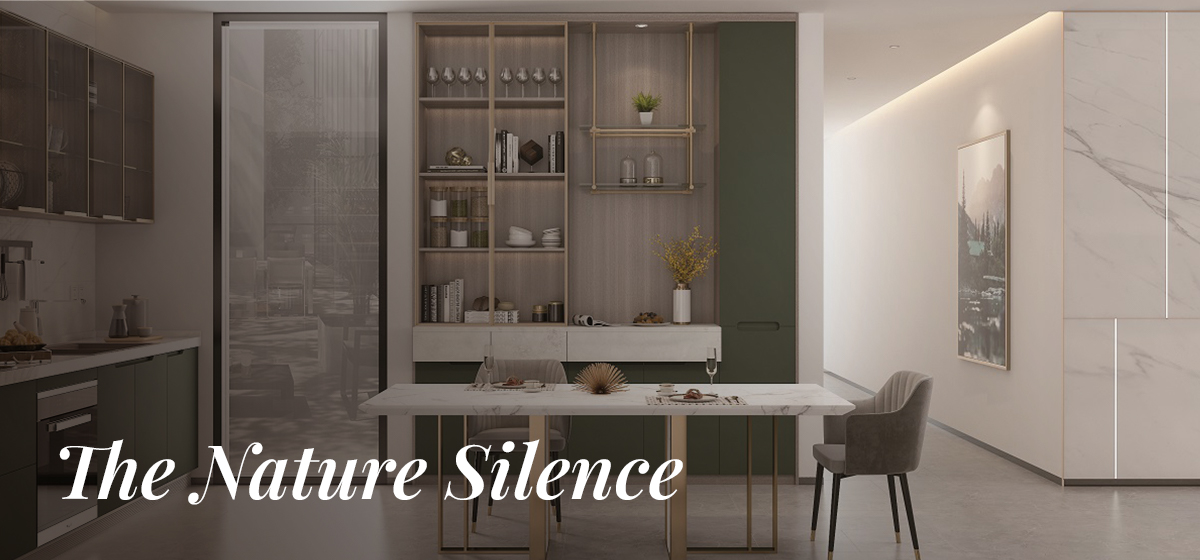 The shade of the forest under the sunlight transforms into Tai Emperor grey pomelo. Venetian white captures the texture and colour of mountain snow. The addition of wild green brings a touch of grassland atmosphere to the space, creating a natural and harmonious living environment.