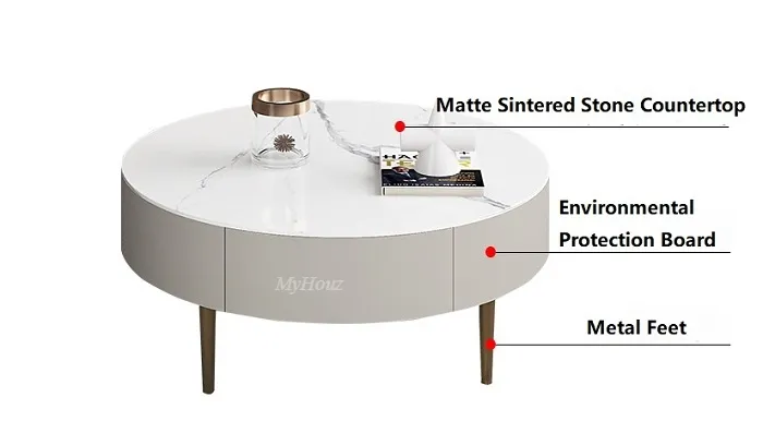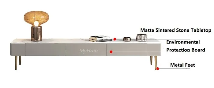 Materials: Matte Snow White Sintered Stone Tabletop + Environmental Protection Board + Metal Feet