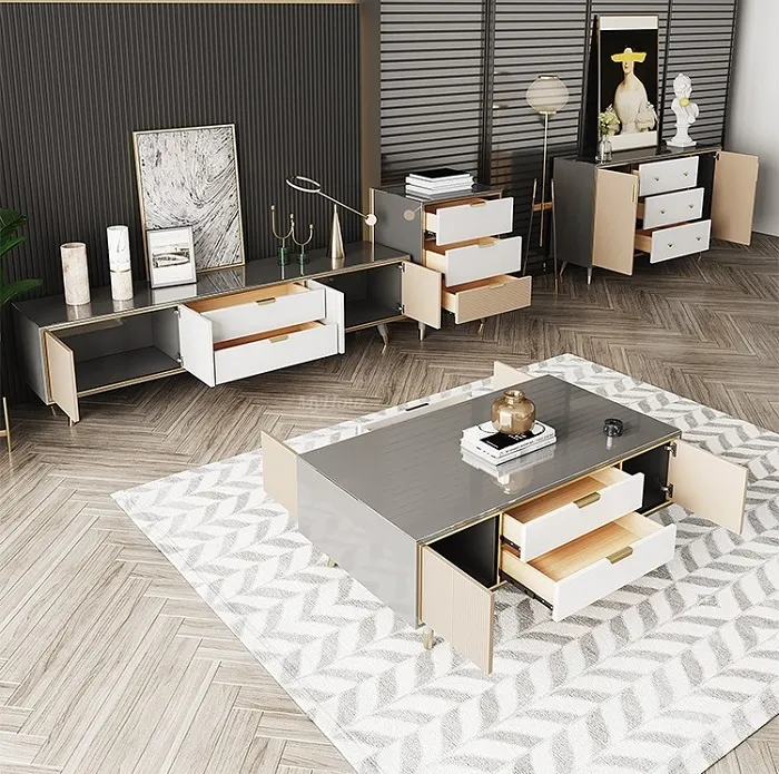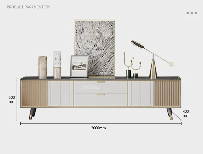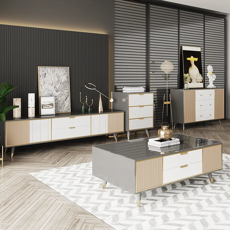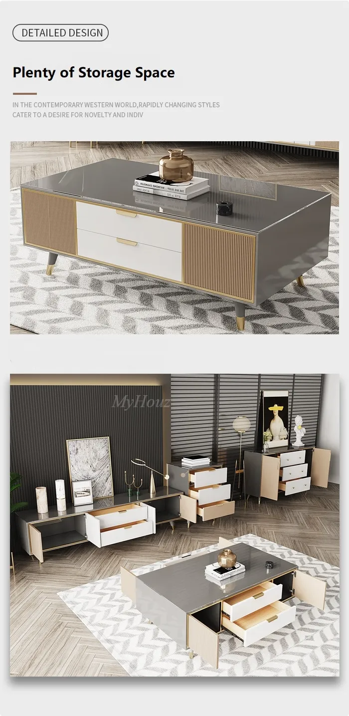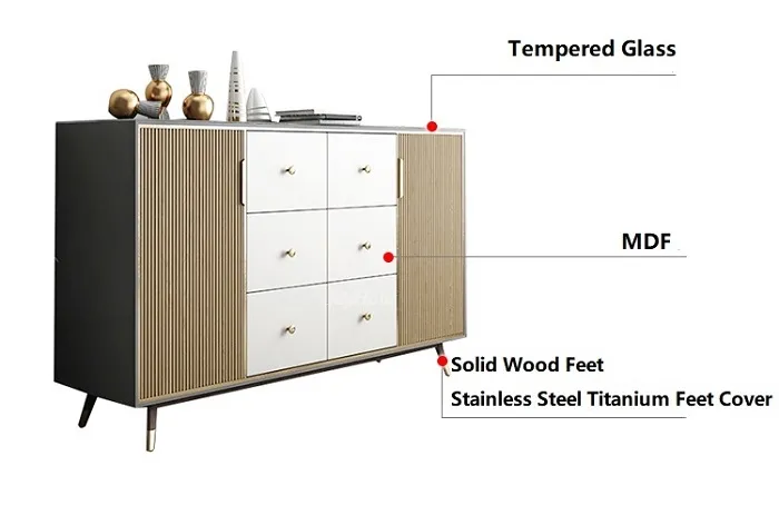 Materials: High-Quality Tempered Glass + Stainless Steel Gold Plating Cabinet + E1 MDF + Lacquered Pine Drawers + Noise Elimination Slide Rail + Solid Wood Feet + Stainless Steel Feet Cover